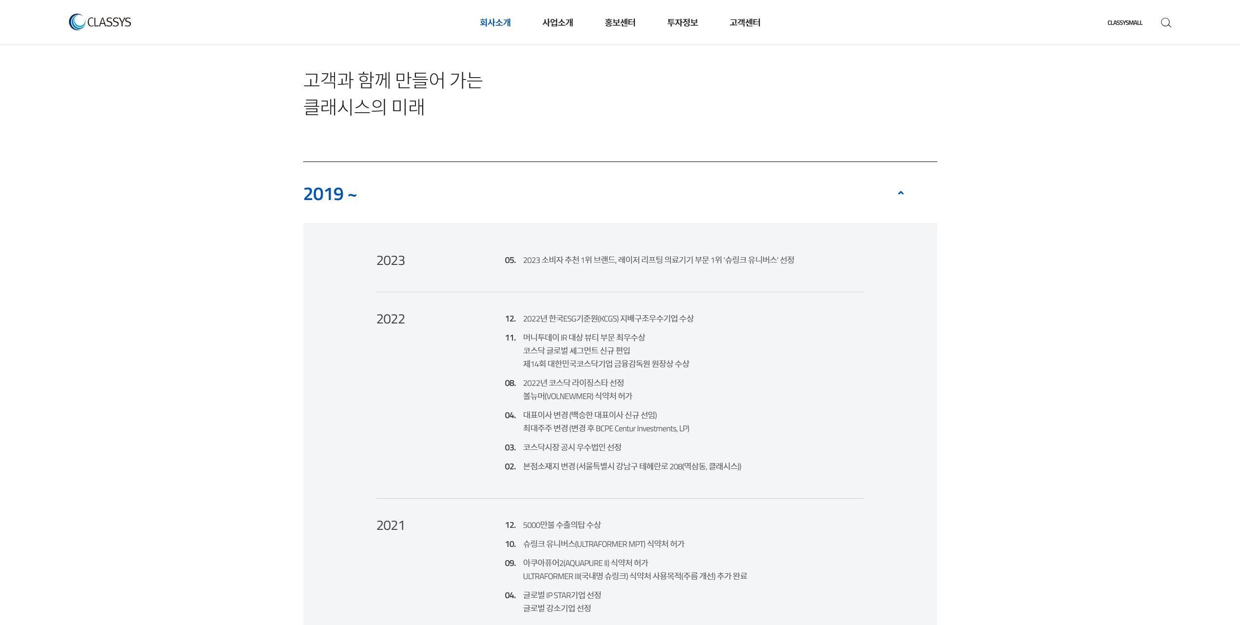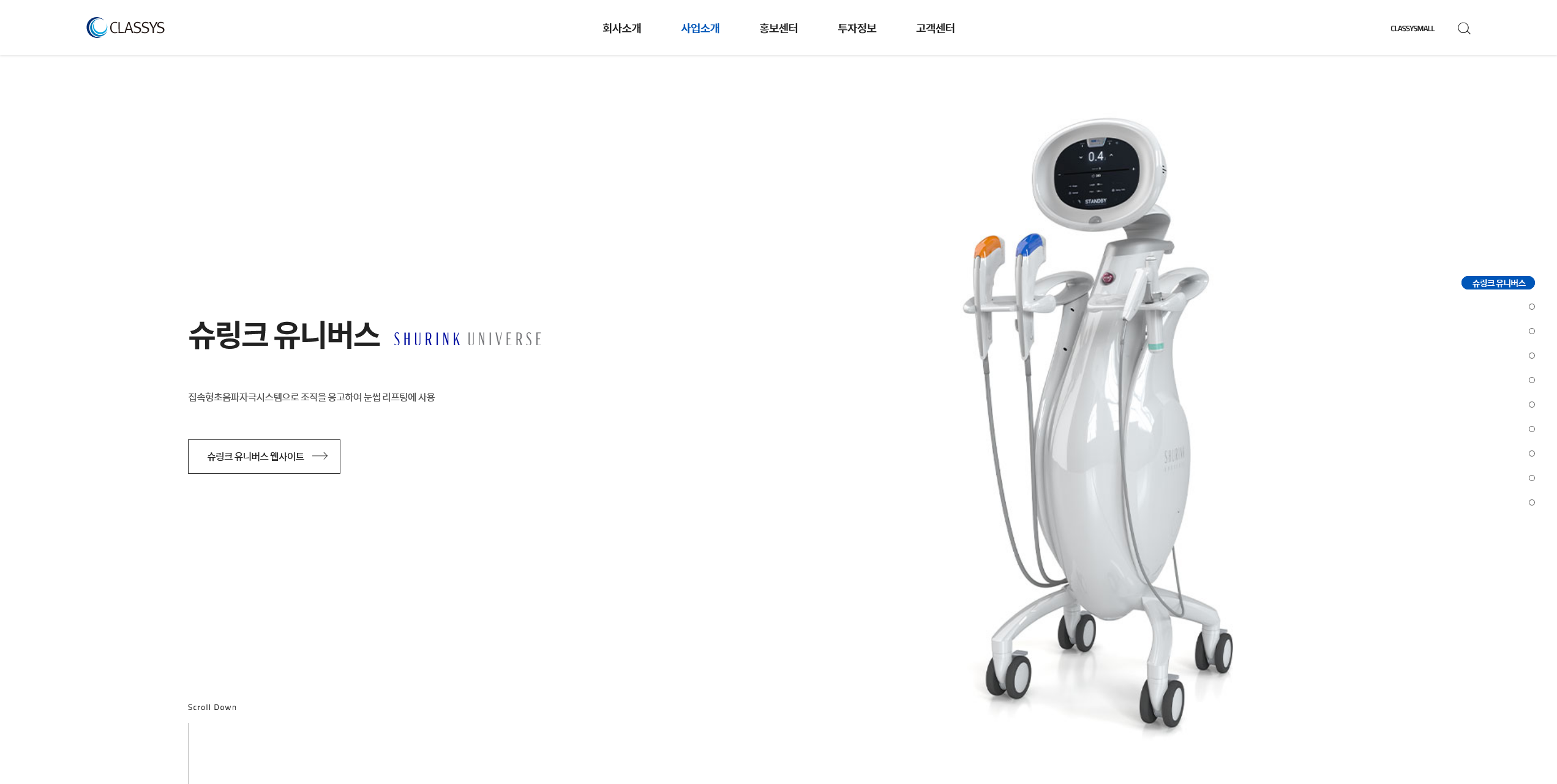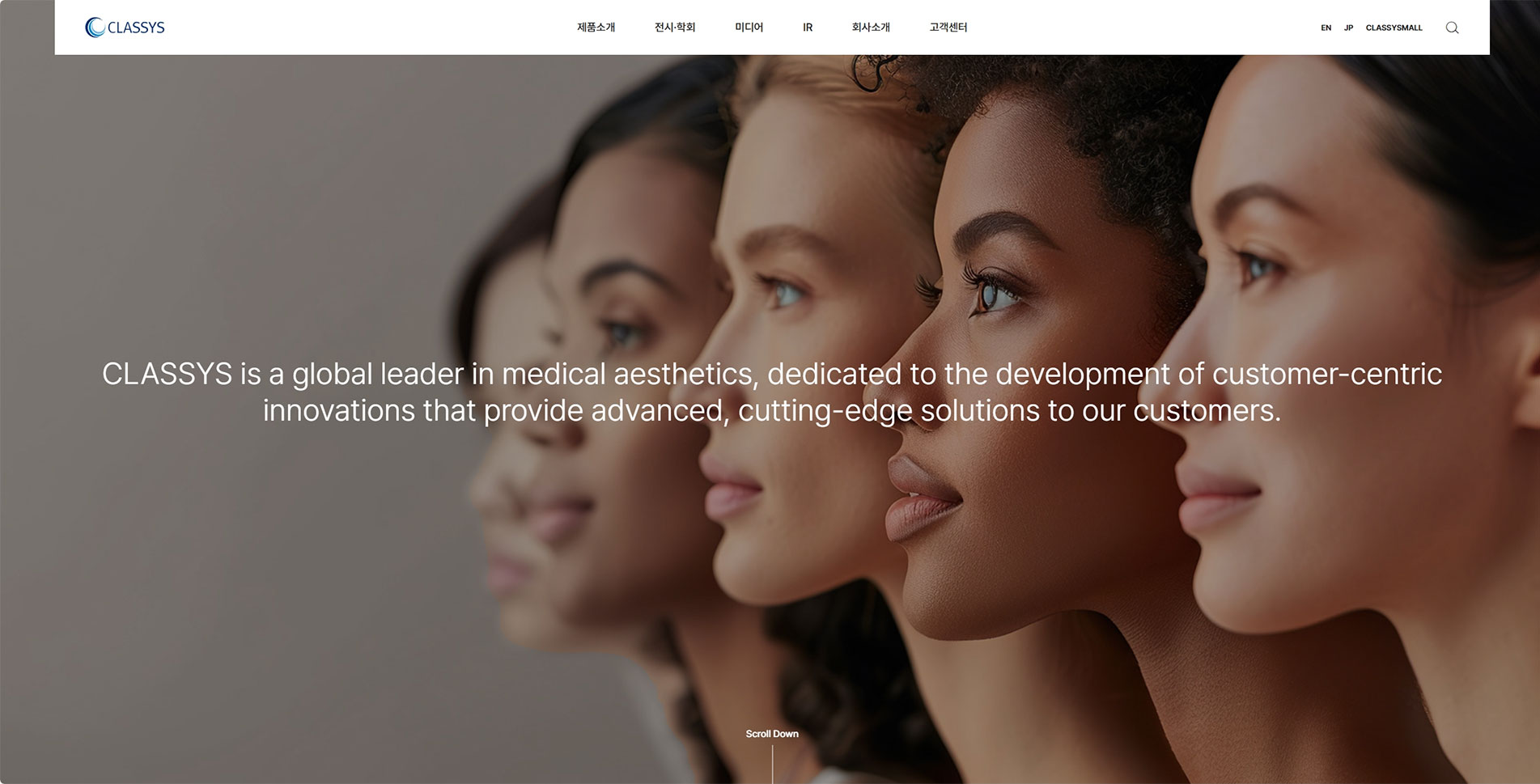 클래시스는 글로벌 미용 의료기기를 제조 및 판매하는 코스닥 상장 법인으로 직관적인 정보 전달, 공시 정보 연동 등을 중점으로 구축하였습니다.